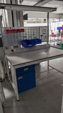 Steel framed workbench with power points, overhead lighting, cupboard and draw under