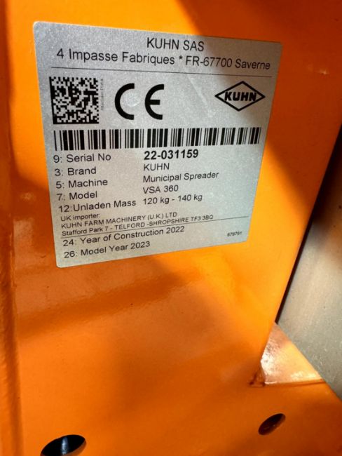 1: Kuhn VSA360, Fertiliser Spreader, Serial Number: 22-031159, Year of Manufacture: 2022